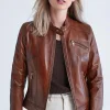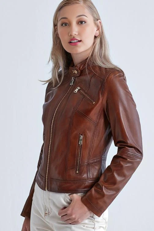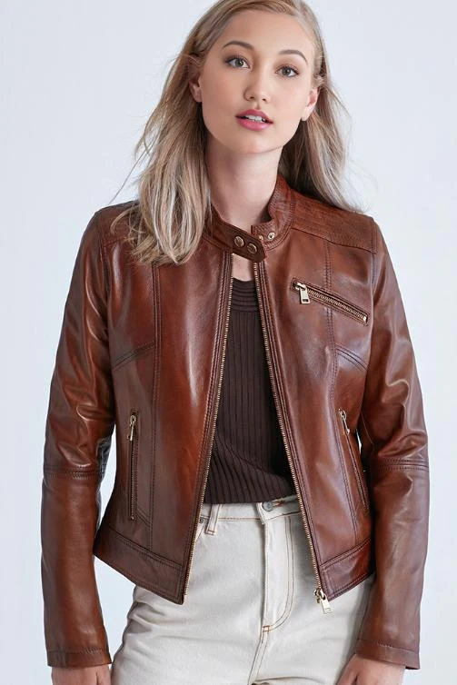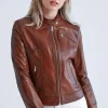 - Elevate your wardrobe with this stylish brown leather jacket for women.