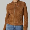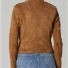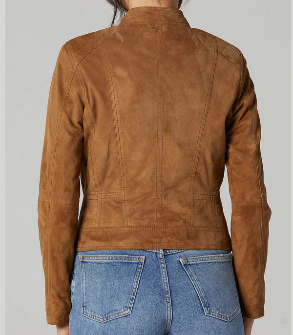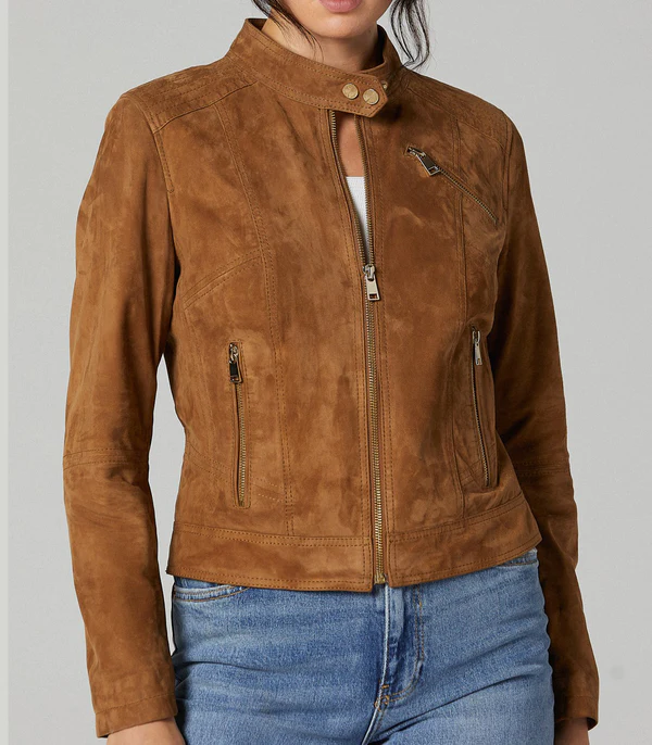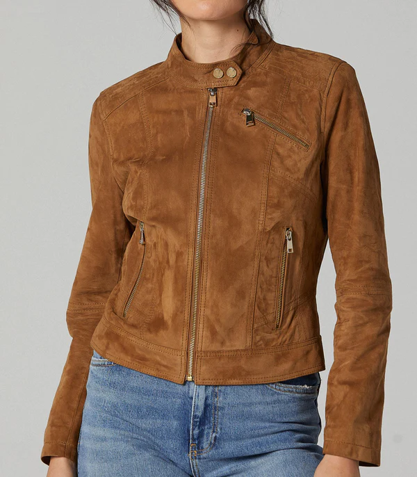 - Elevate your wardrobe with this iconic women’s suede brown leather jacket.