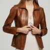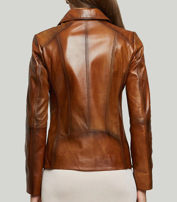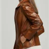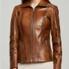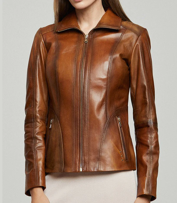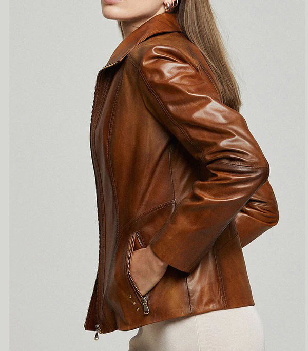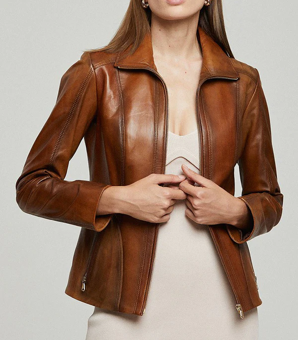- Elevate your wardrobe with this iconic women’s brown leather jacket